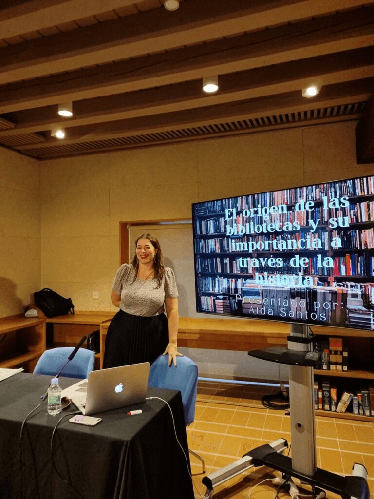 En esta ocasión, Aida Santos, bibliotecaria de la Universidad de Diseño, Innovación y Tecnología (UDIT), fue la encargada de liderar este evento con una inspiradora conferencia sobre la Historia de las Bibliotecas. Santos llevó a los asistentes a un recorrido histórico desde los orígenes de las bibliotecas en las antiguas tablillas de arcilla en Mesopotamia hasta los espacios digitales que conocemos hoy, mostrando la evolución y relevancia de estas instituciones a lo largo de los siglos.