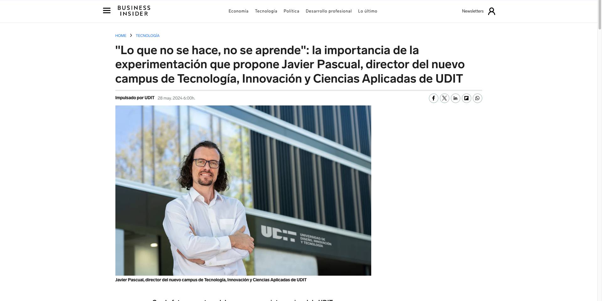 Entrevista a Javier Pascual, director del nuevo Campus Internacional de Tecnología, Innovación y Ciencias Aplicadas de UDIT, Universidad de Diseño, Innovación y Tecnología, para el periódico digital Business Insider.