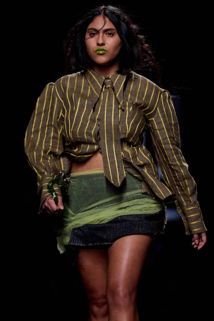 La propuesta de la diseñadora se presenta como femenina y ruda, tal y como ella misma visualiza a la mujer actual. Destacan los colores rojo, amarillo y azul, sobre los tonos terrosos desarrollados en colaboración con Revoco, un proveedor textil con sede en Barcelona que compra y vende excedentes textiles para su reutilización, fomentando la circularidad en el mundo de la moda.